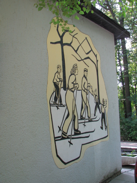 Virágvölgy állomás falán sízők csúszkálnak.