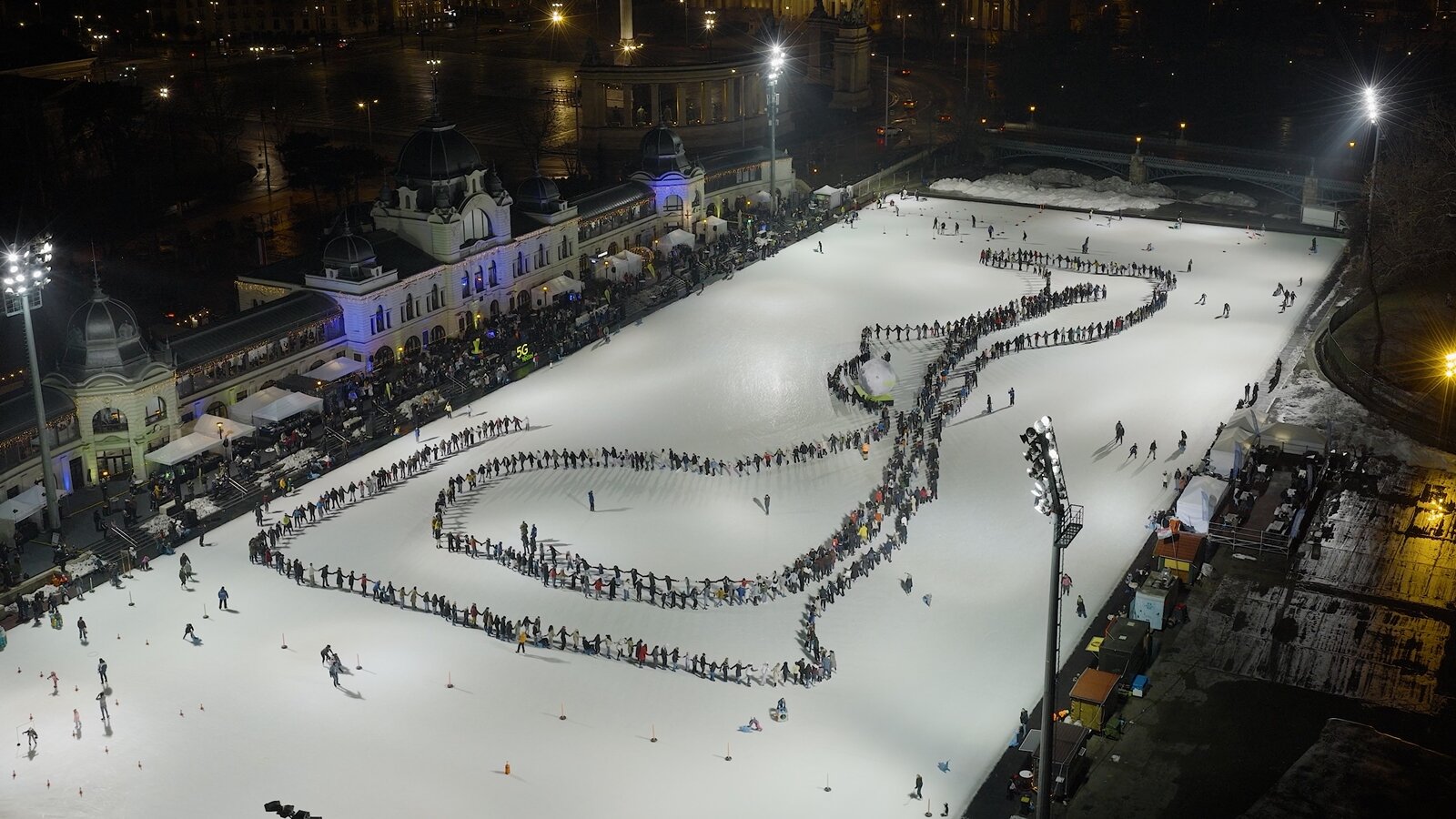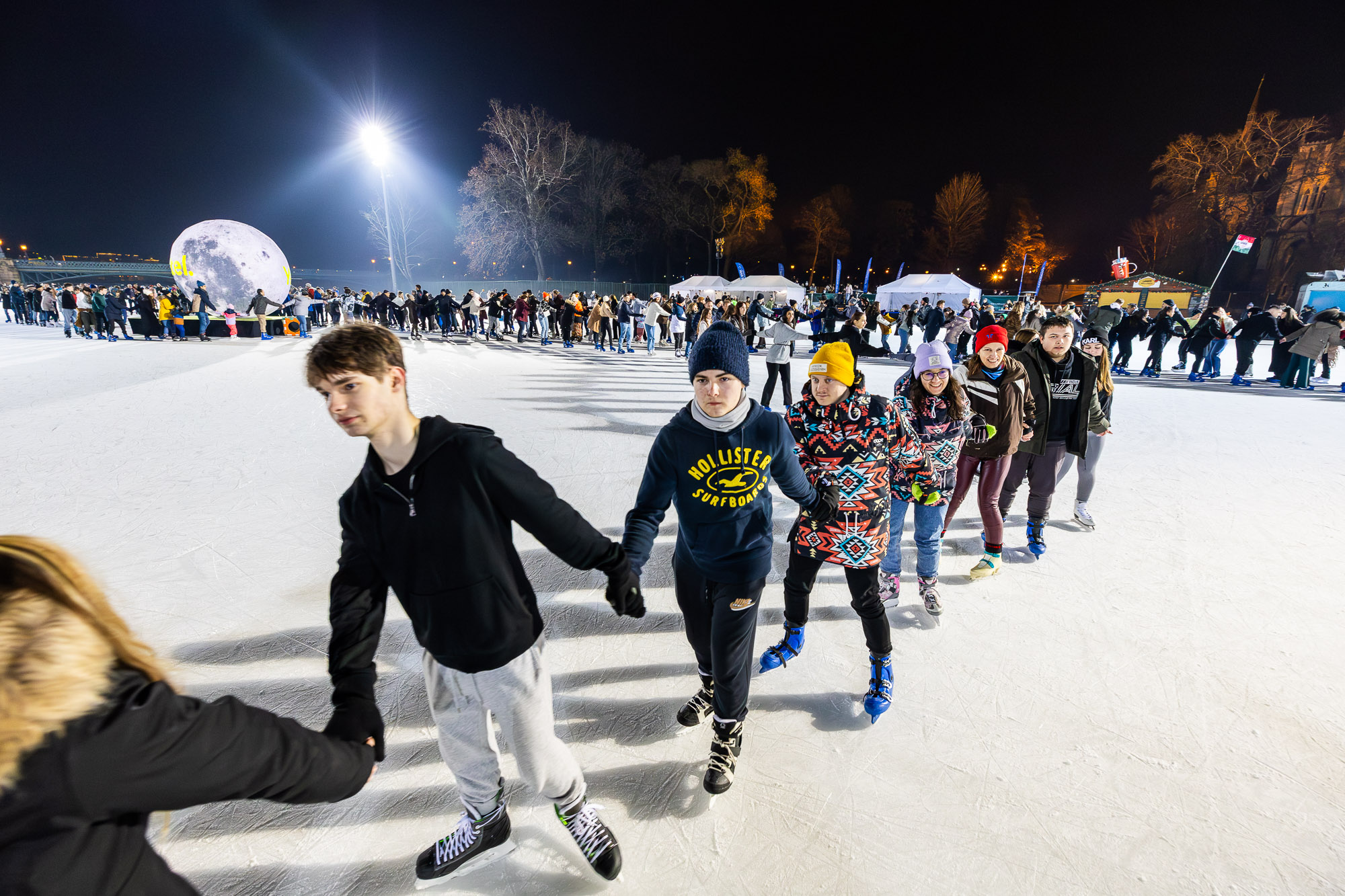 Az este tetőpontján a tömeg a jégre lépett, hogy valami egészen különlegeset hozzon létre: 695 korcsolyázó alkotott egyetlen, több száz méteren kígyózó, összekapcsolt emberláncot, amely új, hitelesített magyar rekordot jelent az „együtt korcsolyázás” kategóriájában. Az új magyar rekord meghaladja a jelenlegi Guinnes-rekorder 395 fős létszámot, amit egy igazán „jégre termett” országban, Kanadában jegyeztek fel.